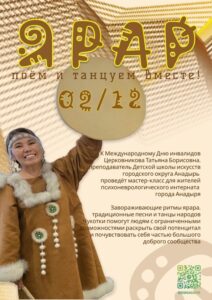 В рамках проекта «Эстафета доброты 2025» и в преддверии празднования Дня образования Чукотского автономного округа состоится мастер-класс Церковниковой Татьяны Борисовны «Ярар. Поём и танцуем вместе!»