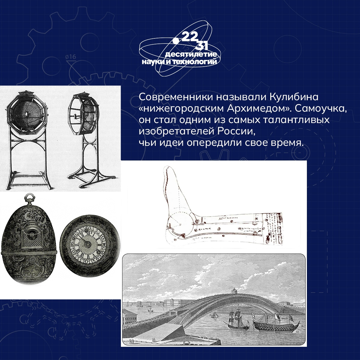 28 июня в России отмечается День изобретателя! В честь праздника вспоминаем великого русского изобретателя XIX века Ивана Кулибина гения, опередившего свое время. Рассказываем в карточках, чем запомнился выдающийся механик, и вспоминаем главные изобретения «нижегородского Архимеда». #десятилетиенауки