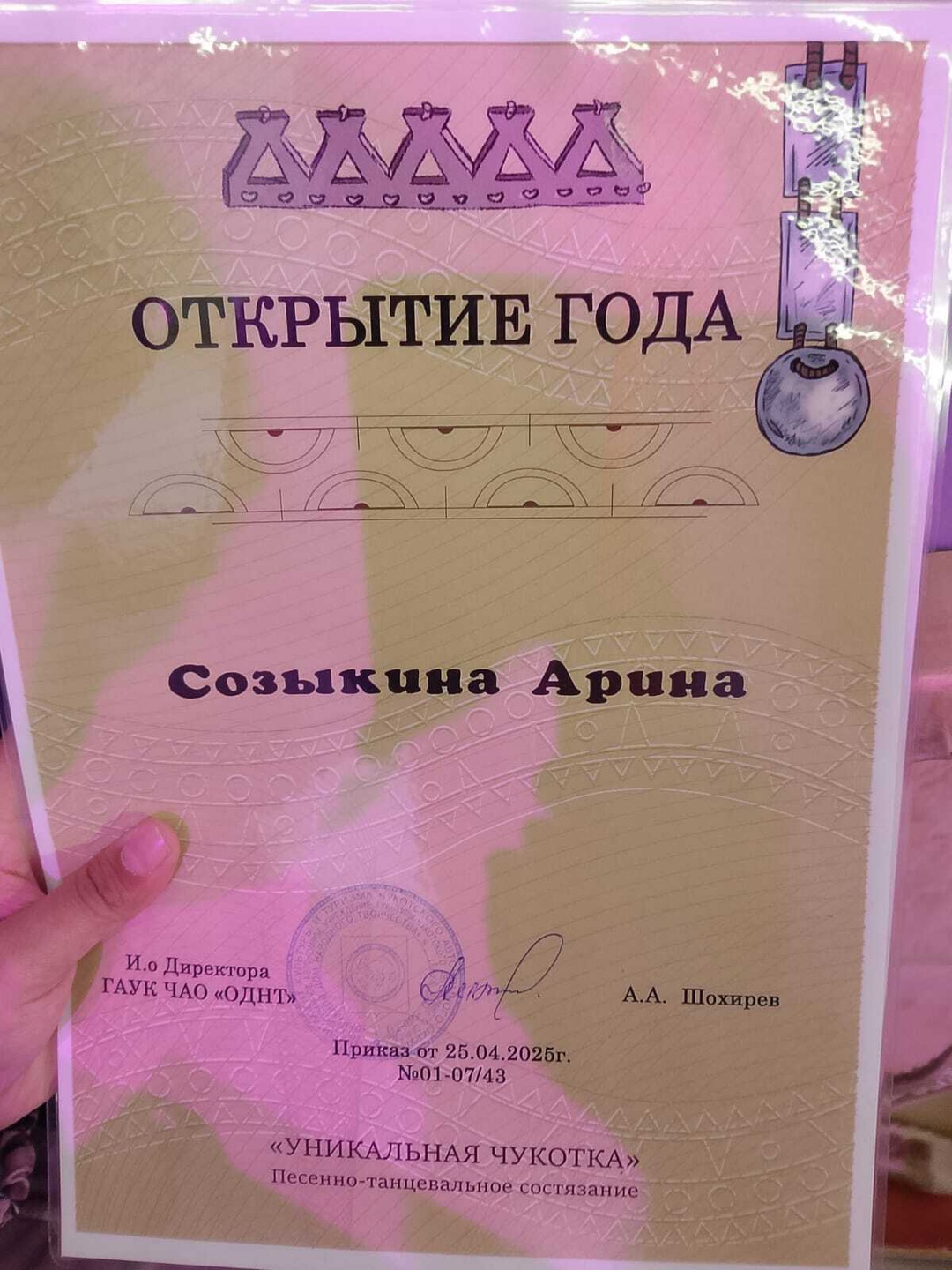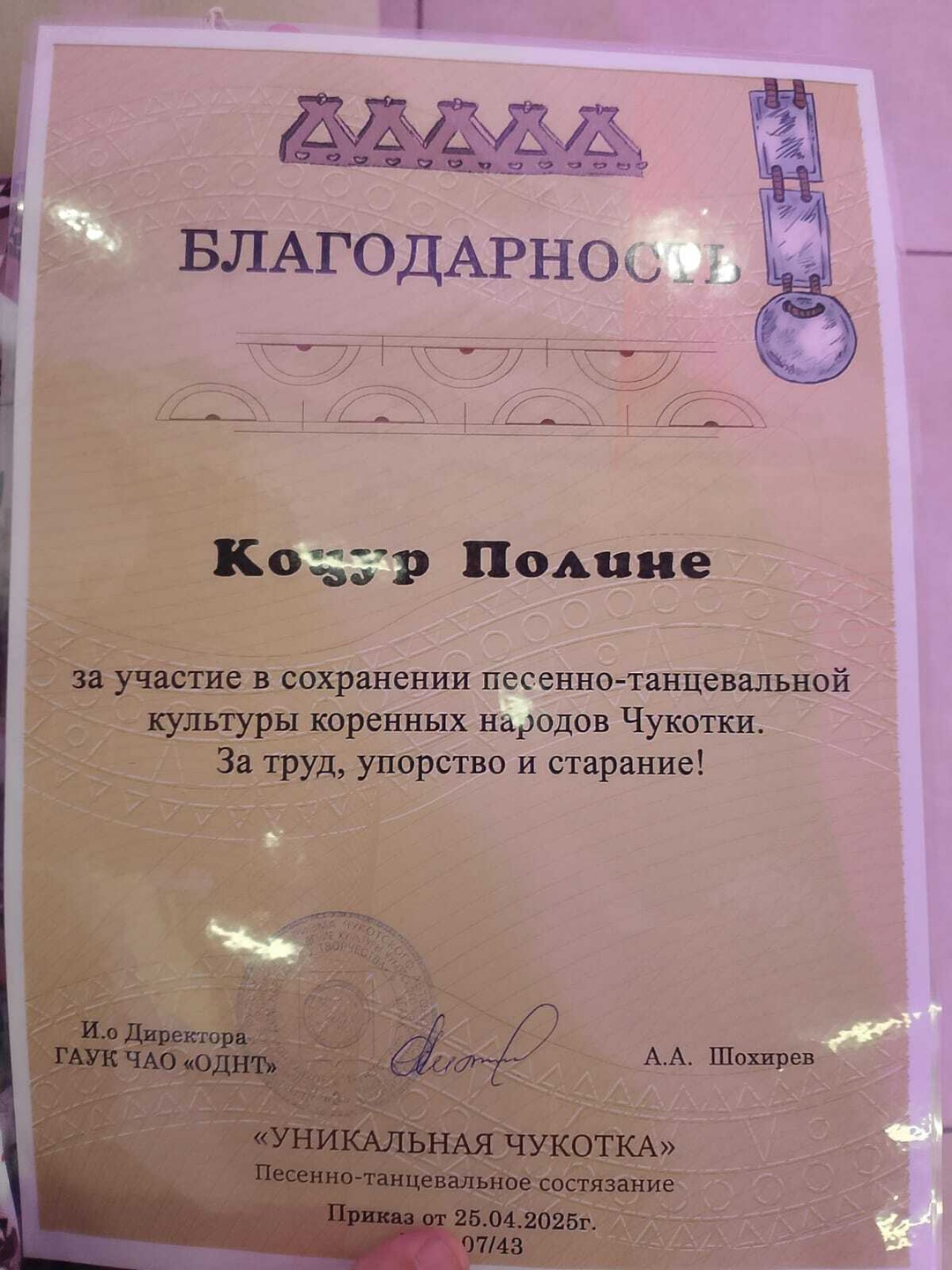 Когда традиции встречаются с талантом, рождается магия Участницы фольклорного ансамбля «Яраркай» — Созыкина Арина и Коцур Полина — достойно выступили в песенно-танцевальном состязании «Уникальная Чукотка» в номинации исполнение чукотской песни. Сколько силы, уважения к традициям и любви к родной земле было в их исполнении — не передать словами! И у нас есть повод для гордости! Созыкина Арина удостоена особого приза — «Открытие года»! Это не просто награда — это признание таланта, души и той искренности, с которой она передала звучание родной земли. Отдельные аплодисменты — наставнику Арины и Полины, Церковниковой Татьяне Борисовне! За чуткость, мастерство и вдохновение, которое рождает победы!