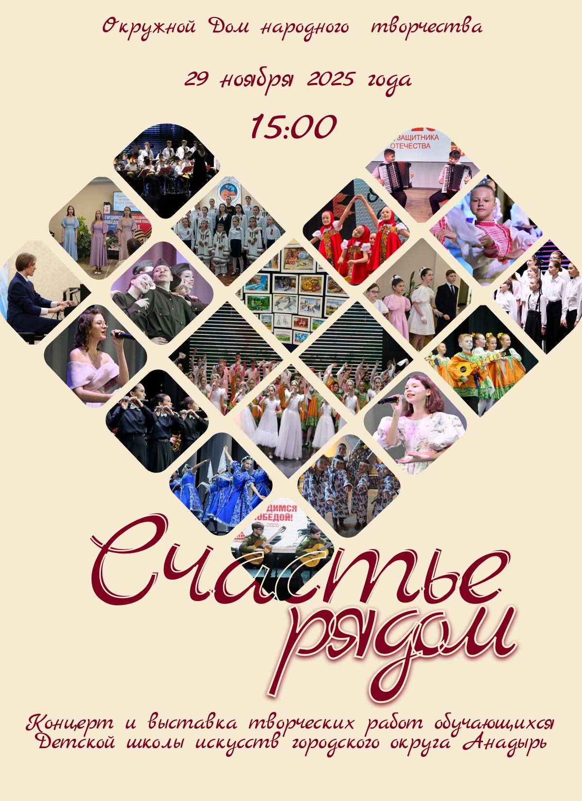 «Счастье рядом» отчётный концерт и выставка творческих работ обучающихся Детской школы искусств в Окружном Доме народного творчества! 29 ноября в 15:00 на сцене Окружного Дома народного творчества лучшие солисты и творческие коллективы Детской школы искусств представят концертную программу «Счастье рядом!». В концерте примут участие хор «Акварель», хореографический ансамбль «Северная Росинка», оркестр народных инструментов «Северное сияние», ансамбль духовых инструментов «Импульс», вокальный ансамбль «Сюрприз», фольклорный ансамбль «Яраркай», солисты, дуэты, трио, Юные артисты исполнят вокальные, инструментальные произведения отечественных композиторов и хореографические постановки, наполненные искренностью и вдохновением, посвящённые тому, как прекрасен мир вокруг нас, как важны дружба и поддержка семьи, как много радости приносит творчество! В фойе Окружного Дома народного творчества вниманию зрителей будет представлена экспозиция работ изобразительного и косторезного искусства. Юные художники и косторезы поделятся своим видением счастья в дружбе, семье, творчестве и окружающем мире! Приходите всей семьей! Погрузитесь в атмосферу тепла, доброты и вдохновения!
