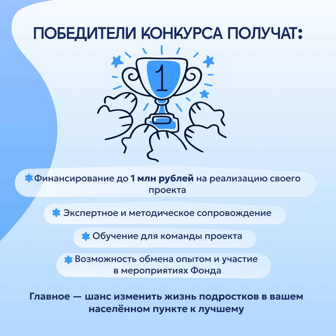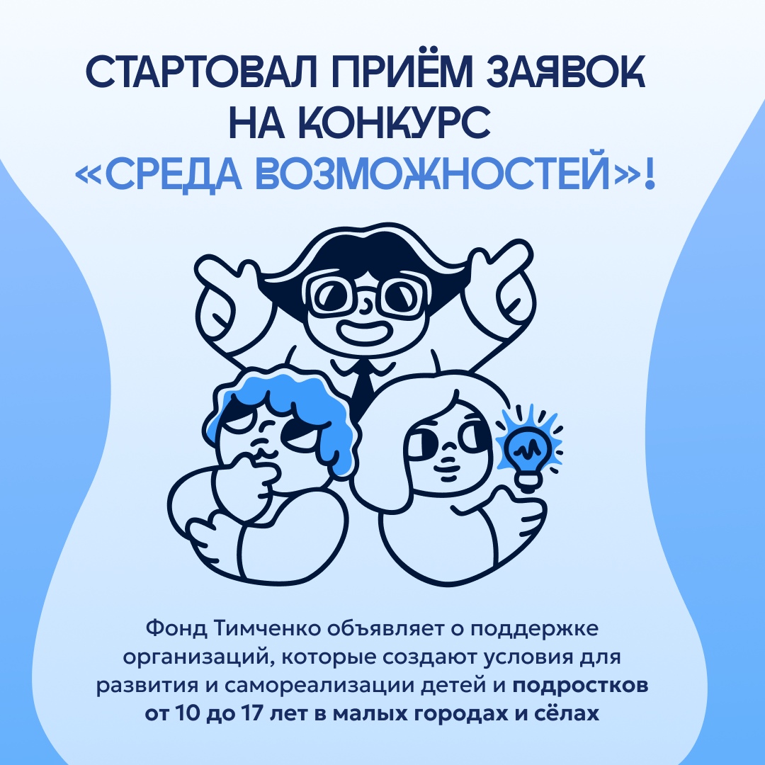 Стартовал приём заявок на конкурс «Среда возможностей» Фонд Тимченко объявляет о поддержке организаций, которые создают проекта для развития и самореализации детей и подростков от 10 до 17 лет в малых городах и сёлах. Главный приз грант до 1 млн рублей и сопровождение проекта на всех этапах. Узнать о проекте и подать заявку можно на официальном сайте конкурса (https://clck.ru/3NzH95). Подробности в карточках.