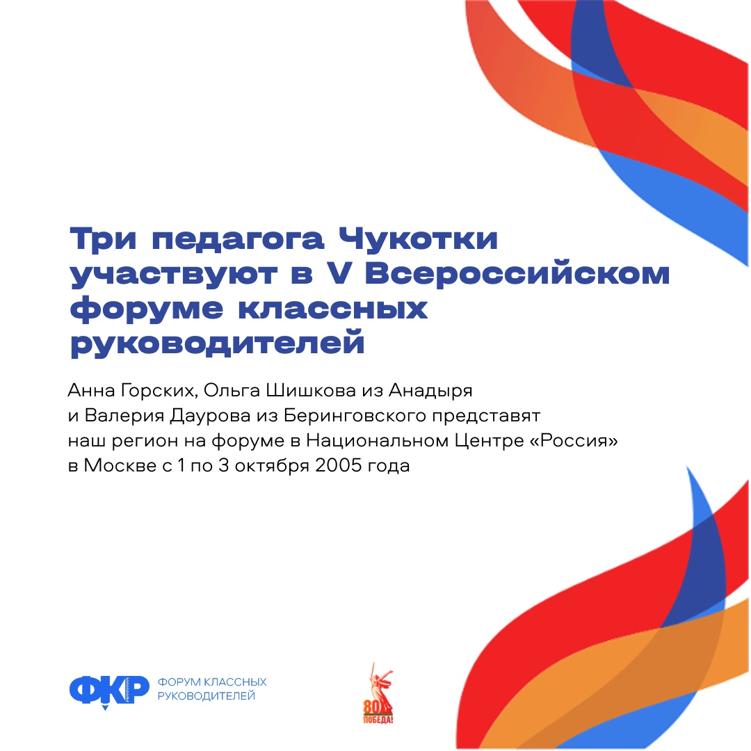 Три педагога Чукотки участвуют в V Всероссийском форуме классных руководителей Завершился отбор конкурсантов. Анна Горских, Ольга Шишкова из Анадыря и Валерия Даурова из Беринговского представят наш регион на форуме в Национальном Центре «Россия» в Москве с 1 по 3 октября 2005 года. Претенденты прошли строгий отбор: анкетирование, тестирование по направлениям «История педагогики», «Основы педагогики» и «Оценка компетенций», а также записали видеовизитку на тему «Моя воспитательная практика». Форум сплотит классных руководителей в единое сообщество. Их ждут лекции экспертов, дискуссии и культурная программа, посвященные воспитанию на основе традиционных ценностей. Всего подано 50 тысяч заявок со всей России. Возраст участников от 19 до 77 лет. Стать онлайн-участником можно по ссылке (https://clck.ru/3AWjzG). При поддержке Фонда Гуманитарных Проектов. Стратегический партнер АНО «Диалог Регионы». Мероприятие организовано Министерством просвещения РФ по поручению Президента России Владимира Путина.